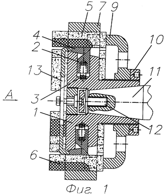 По достижении абразивными брусками заданной величины износа на абразивный инструмент, не снимая его со станка, устанавливают съемник 13 и винтами 14 отжимают клинья 4 от абразивных брусков 5, тем самым высвобождая последние. Затем ослабляют гайку 10 и навинчивая толкатель 9 на хвостовик корпуса 1, выдвигают абразивные бруски на заданную величину и вновь фиксируют толкатель 9 гайкой 10. После этого, вывинчивая винты 14, снимают с инструмента съемник 13, тем самым высвобождая клинья 4, которые под действием пружин 3 и сухарей 2 прижимают абразивные бруски 5 к ободу 7, фиксируя их в заданном положении с упором в толкатель 9. Инструмент вновь готов к работе.