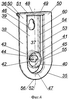 Ответная часть 35 (фиг.4) в данном случае выполняет функцию поясного крепления, предназначенного для фиксации держателя инструмента на поясе 61. Конструкция ответной части 35 симметрична относительно плоскости, проходящей через продольную ось 52 ответной части 35 (продольной считается ось, расположенная по центру ответной части 35 параллельно большим сторонам 53 пластины 37 и дугообразному элементу 38). Пластина 37 и дугообразный элемент 38 расположены параллельно друг другу с просветом 60, величина которого должна быть достаточна для продевания в него пояса 61. Большие стороны 53 пластины 37 выполнены с бортиками 54 переменной высоты, имеющими наибольшую высоту в месте пересечения с меньшей стороной 48 пластины 37, а наименьшую высоту (в частности, нулевую) – в месте перехода больших сторон 53 пластины 37 в скругленный свободный конец 47 пластины 37. В частном случае бортики 54 выполняют функцию ребер жесткости и увеличивают прочность соединения пластины 37 с планкой 36. Напротив середины меньшей стороны 48 пластины 37 расположено дополнительное отверстие 46, предназначенное для подвешивания держателя инструмента.