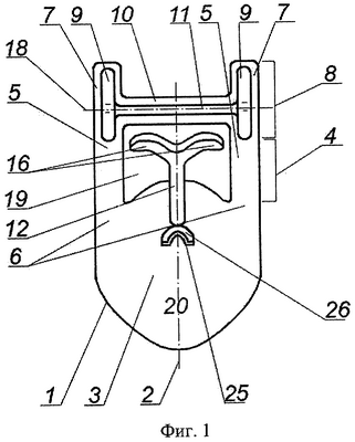Основание 1 (фиг.1-3) представляет собой деталь сложной формы, симметричную относительно плоскости, проходящей через продольную ось 2, и состоящую из площадки 3, изгибной пружины 4, подпружиненного элемента 8, ограничителей 9 и кронштейна 12 с первым 13 и вторым 14 концами, опорного разветвления 16.
