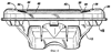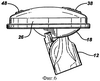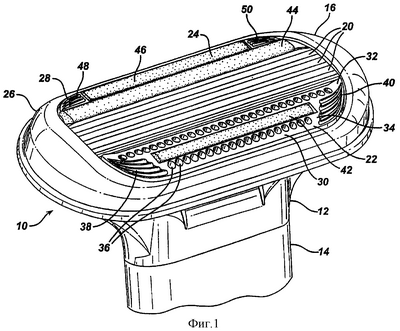 Компоненты колпачка 26 включают в себя удлиненную переднюю полоску 44 для подачи средства, облегчающего бритье, заднюю удлиненную полоску 46 для подачи средства, облегчающего бритье, и упругие ребра 48, 50, выступающие за пределы концов удлиненной полоски 46. Все ребра 48, 50 начинаются из положения немного дальше концов смазывающей полоски 46, и внешние концы имеют тенденцию изгибаться вперед, повторяя изгиб проема 28 в зажиме 26. Ребра 48, 50 защищают кожу бреющегося от повреждения о край зажима 28 в области угла, а также обеспечивают захват кожи по бокам, а не в середине. Кроме того, если бреющийся кладет картридж лицевой стороной на поверхность, ребра 48, 50 поднимают над поверхностью полоски 44, 46 для подачи средства, облегчающего бритье, что позволяет им высохнуть и не прилипать к поверхности. Использование двух полосок для подачи средства, облегчающего бритье, позволяет применять два различных типа средств, облегчающих бритье (например, различные смазывающие вещества или смазывающее вещество и другое средство, облегчающее бритье, например средство для смягчения волос или средство медицинского назначения), что обеспечивает гибкость в управлении качеством бритья.