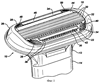 Защитный элемент 22 включает в себя упругий элемент 30, в котором спереди и сзади сформированы два ряда 32, 34 круглых углублений 36 и с двух сторон сформированы ребра 38, 40, выступающие за пределы концов удлиненной центральной полоски 42 (обеспечивающей смазку) для подачи средства, облегчающего бритье, которая прикреплена при помощи упругого элемента 30. Углубления 36 цилиндрической формы имеют диаметр 0,8 мм и глубину 0,62 мм, а расстояние между ними составляет 1,05 мм. Углубления 36 в переднем ряду 32 сдвинуты относительно углублений 36 в заднем ряду 34. Полоска 42 для подачи средства, облегчающего бритье, выступает вверх с поверхности упругого элемента 30. Имеется четыре ребра 38 и четыре ребра 40, ребра спереди немного выступают перед концами смазывающей полоски 42 и каждое ребро, находящееся позади переднего ребра, начинается с положения, которое немного выступает вперед. Наружные концы ребер 38, 40 искривлены назад, повторяя искривление проема 28 в зажиме 26. Ребра обладают способностью в большей степени захватывать кожу бреющегося по бокам, чем в середине.