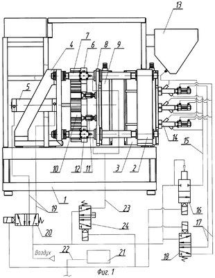 Полуавтомат содержит бункер 13 (фиг.1, 2), задувные устройства 14 с инжекционными магистралями 15 и пневмозатвором 16, магистралями управления 17, задувными устройствами 14 с распределителем 18, магистраль 19 с распределителем 20, систему управления 21 с линиями связи 22 (фиг.1, 2), магистраль 23 с распределителем 24 для подачи воздуха в пневмопривод фиксатора 12 (фиг.1, 2, 4).