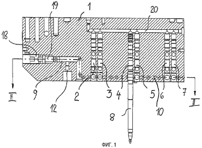 Крепление выдувных оправок 8 в вертикально расположенных посадочных отверстиях 2-7 осуществляется зажимом. На фиг.2 показаны две зажимные колодки 13, 14, которые расположены в проходящих, в сущности горизонтально относительно выдувных оправок 8, отверстиях 11 и контактируют с поверхностью выдувной оправки 8. В частности, радиальные зажимные колодки 13, 14 расположены примерно по диагонали напротив друг друга. Это облегчает изготовление радиальных сверлений 11 и центровку прижатой зажимными колодками 13 выдувной оправки 8. Зажимные колодки 13, 14 для зажима всех выдувных оправок 8 приводятся в действие через соединительную среду, предпочтительно гидравлическую жидкость, помещенную в сообщающейся системе отверстий 9, 10. Система отверстий включает центральное питающее отверстие 9 и отходящие от него вертикальные отверстия 10, находящиеся в соединении с горизонтальными отверстиями 11, в которых расположены радиальные зажимные колодки 13, 14. За счет соединительной среды зажимные колодки 13, 14 перемещаются в радиальном направлении к поверхности выдувных оправок 8. При этом регулирование зажимных колодок 13, 14 осуществляется одновременно на всех выдувных оправках 8. Зажимные колодки 13, 14 соединены с установочными плунжерами 16, 17, которые находятся в прямом контакте с соединительной средой и перемещаются в горизонтальных отверстиях 11. Зажимные колодки 13, 14 и установочные плунжеры 16, 17 образуют при этом единое целое.