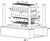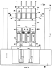 В показанном примере выполнения блок 24 содержит четыре ряда комплектов, каждый из которых содержит камеру 32 термоформования и камеру 34 ввода, расположенные одна над другой. Таким образом, блок 33 камер ввода имеет четыре группы щелей, связанных с соответствующими камерами четырех рядов. По две группы щелей 38, сообщающихся с соответствующими камерами наружного ряда и с камерами смежного с ним внутреннего ряда, расположены на двух противоположных сторонах блока 33.