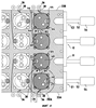 В камерах наружных рядов Е1 и Е2 зона Z1 контакта между приводным колесом 46 и стенкой камеры отстоит от прохода для введения полосы, образованного щелью 38. На чертеже видно, что концы лент 26 проходят расстояние почти в четверть оборота в камерах наружных рядов до места контакта с приводными колесами 46. Следует отметить, что для этих камер длина прохода, образованного щелью 38, очень невелика и значительно меньше длины полосы, так как эти камеры расположены близко к стороне 33А или 33В блока камер ввода, на которых расположены средства для резки ленты.