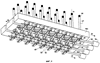Для упрощения на фиг.2 показаны только две ленты 26, причем каждая из них подается к соответствующей камере 34 ввода наружных рядов Е1 и Е2 блока 24. Как показано на фиг.4, лента 26 подается в каждую камеру ввода, в том числе в камеры внутренних рядов I1 и I2. Стенки камер 34 ввода снабжены щелевыми проходами или щелями 38, в которые могут быть введены передние концы лент. Камеры 32 образованы в блоке 31 камер термоформования, а камеры 34 образованы в блоке 33 камер ввода, расположенном под блоком 31.