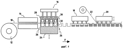 Показанная на фиг.1 установка содержит ряд станций, через которые полоса 10 из термопластичного материала подается приводными средствами 12. В направлении по стрелке F движения ленты установка содержит станцию 14 нагрева, станцию 16 термоформования, заливочную станцию 18 для заполнения контейнеров, изготовленных термоформованием, и укупорочную станцию 20 для закрытия отверстий контейнеров запечатывающей лентой 22.