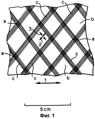 Однако на практике средний покупатель сельскохозяйственного брезента в значительной степени делает выбор на основе фактуры и внешнего вида и отвергает брезент плотностью 70 г/м2 из-за его «пленочности» и потому, что он выглядит как простая пластиковая пленка. Проблема «пленочности» уменьшается применением предыдущего изобретения того же изобретателя, раскрытого в WO-A-9314928, которое кратко описано ниже в связи с одним специальным вариантом настоящего изобретения, тогда как проблема внешнего вида, напоминающего простую пластиковую пленку, остается. Однако есть основания полагать, что рисунок пересекающихся жил по настоящему изобретению, покажет, что этот материал является кроссламинатом и, следовательно, обладает особой прочностью. Поэтому пользователь может видеть, что рисунок явно не напечатан на поверхности ламината, а находится внутри. Слегка смазанные кромки линий рисунка, являющиеся неизбежным результатом технологии совместной экструзии, показывает, что линии возникли при производстве пленки, а не при позднейшей печати на одном или нескольких слоях. В целом такой рисунок показывает, что это – кроссламинат, и поэтому от него можно ожидать прочности. Более того, рисунок, разумеется, не стирается в результате абразивного воздействия, тогда как рисунок, напечатанный на ламинате, очень нестоек к таким воздействиям.