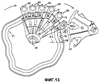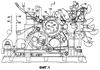 Пара следящих элементов 29, 27 установлена с возможностью поворота на поверхности опорной штанги 43 напротив поверхности, на которой смонтирован монорельс 37. Следящие элементы установлены с помощью короткого валика 25, который выступает из отверстия 23 в опорной штанге 43. Следящие элементы 29, 27 помещаются в замкнутой рабочей поверхности кулачка (эталонный копир) 21. Замкнутая рабочая поверхность 21 кулачка направляет узлы 50 оправки по пути печатания – схематически показано на Фиг.13 и 14.