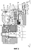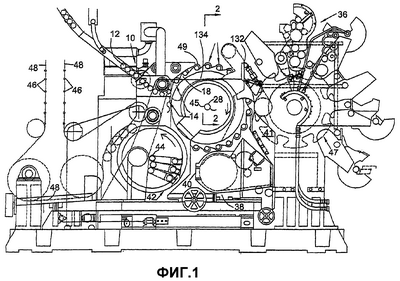 Чтобы вернуть оправку 78 из не-печатающего положения в печатающее положение, возвращающий работающий от кулачка ролик 110 можно переместить в направлении против часовой стрелки, в результате чего происходит кручение короткого валика 102 в направлении против часовой стрелки. После того как пружина 114 пройдет центральное положение, т.е. над осью 74 вала 56 оправки, она будет оттягиваться от стойки 118 пружины, пока стенка 122 не упрется в регулирующий элемент 120 и тем самым вернет оправку 78 в положение печатания.