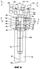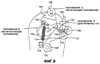 Внешний кольцевой паз 88 на наружной поверхности кольцевого делителя 62 герметично уплотнен, чтобы герметизировать проходы воздуха от попадания в них смазки из конических роликоподшипников 58, 60. Контргайка 100 с несущей поверхностью на ней, обращенной в осевом направлении внутрь ее поверхности, крепит первую часть 56а вала 56 оправки к опорной штанге 43. Короткий валик 102 первой части 56а вала 56 оправки выходит из стопорной гайки 100.