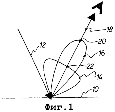 Ссылочной позицией 18 обозначено направление наблюдения, то есть направление на подложку 10 взгляда пользователя. Наблюдатель должен наклонить подложку 10 и позиционировать ее таким образом, чтобы в области зеркального отражения возник источник света. За счет перекрытия тонкопленочной структуры с обеими матовыми структурами области наблюдения, в которых распознается эффект тонкопленочной структуры, предпочтительным образом увеличиваются. В соответствии с фиг.1, например, участок поверхности подложки 10, который покрыт матовой структурой с конусом рассеяния 16, наблюдается в светло-красном цвете, то есть в красном цвете тонкопленочной структуры с соответственно увеличенной интенсивностью. Тот участок поверхности, который покрыт матовой структурой с конусом рассеяния 14, хотя и представляется тоже в красном цвете, однако он вследствие увеличенного диапазона рассеяния является более темным, потому что интенсивность в обозначенном стрелкой 18 направлении наблюдения соответственно снижена. Это наглядно представлено точками 20 и 22.