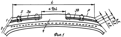 В готовой шине шипы 5 расположены так, как показано на чертеже. Протекторы по фиг.1 и 2-4 показаны в еще не сформованном состоянии, так что отверстия для шипов и рисунок протектора пока отсутствуют. Тем не менее, на фиг.1 показан порядок размещения шипов. Шипы 5 установлены в четыре окружных ряда над полосами промежуточной основы протектора. Узкая часть шипа, по существу, полностью окружена полосами 3а и 3b промежуточной основы, а нижний фланец шипа находится полностью под слоем промежуточной основы внутри слоя резины внешней части протектора. Благодаря такому решению шип хорошо удерживается в протекторе, так как его узкая часть окружена слоем твердой резины. Диаметр нижнего фланца может быть больше обычного, так как при утоплении вершины шипа в протектор до уровня наружной поверхности протектора Р сопротивление эластичного слоя резины внешней части протектора меньше сопротивления обычного слоя резины основания протектора. Слой резины внешней части протектора в его центральной зоне обеспечивает дополнительные потенциальные возможности для формирования рисунка протектора.