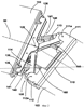 Кроме того, предусматриваемым изобретением преимущественным признаком является то, что между салазками и шарнирным кронштейном предусмотрено демпфирующее звено. Альтернативно демпфирующее звено может быть расположено между шарнирными кронштейнами или лучше – между салазками. Поскольку при расположении по одному демпфирующему звену между салазками и шарнирным кронштейном в общей сложности требуются два таких демпфирующих элемента, форма исполнения с одним, но выполняющим двойное действие демпфирующим звеном между салазками и шарнирными кронштейнами является более дешевой. Эти демпфирующие элементы, или один демпфирующий элемент, выполняют прежде всего задачу выполнения второй ступени изгиба лишь в том случае, если при помощи плоского шарнира достигнута 15° – граница угла изгиба в качестве первой ступени. До угла изгиба 15° салазки блокируются демпфирующим элементом или демпфирующими элементами в их положении. По достижении угла изгиба 15° демпфирующий элемент или демпфирующие элементы отводятся, в результате чего соответствующие салазки в зависимости от пересекаемой кривой перемещаются по консольной направляющей к другим салазкам. Правда, демпфирующий элемент или демпфирующие элементы с углом изгиба более 15° вызывают определенное, хотя и лишь незначительное демпфирование, но основная составляющая демпфирования обеспечивается демпфером, действующим в соответствии с направлением кривой. Это демпфер, который находится с внешней стороны кривой.