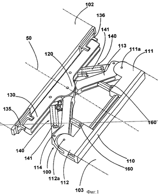 Кроме того, предусмотрены демпфирующие элементы 160 в форме гидравлических цилиндров, расположенных, с одной стороны, между салазками 111, 112, и шарнирным кронштейном 113, 114 – с другой стороны. Главное назначение демпфирующих элементов 160 заключается в том, чтобы с углом изгиба до 15° салазки оставались в своем крайнем конечном положении, т.е. не перемещались относительно друг друга. Лишь после задействования всего угла изгиба 15° за счет поворота шарнирных кронштейнов вокруг шарнирного соединения 120 демпфирующие элементы 160 принимают такую форму, что соответствующие салазки – в зависимости от преодолеваемой кривой – перемещаются по средней продольной оси 50, т.е. в направлении других салазок. Соответствующий демпфирующий элемент 160 выполняет при этом в определенном, незначительном объеме демпфирующее действие, однако основное демпфирование выполняется соответствующим демпфером 141 в соответствии с преодолеваемой кривой.