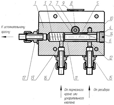 К штуцеру 15 присоединяется магистраль привода резервной тормозной системы, которая может связывать модулятор с тормозным краном напрямик или посредством ускорительного клапана. Через открытое отверстие 16 впускного-выпускного клапана и штуцеры 15 и 17 исполнительный орган тормоза (тормозная камера) обычно сообщается с атмосферой, а при срабатывании резервной тормозной системы – с источником сжатого воздуха.