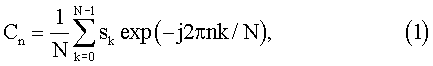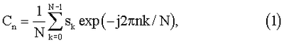Способ дешифрации сигнала осуществляется следующим образом. Сигнал s(t) представлен дискретной последовательностью {sk(tj)} равноотстоящих друг от друга отсчетов. Далее, осуществляется дискретное преобразование Фурье (ДПФ) этой последовательности по формуле (1):