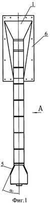 Для крепления в стартовом сооружении патрубок 1 снабжен фланцем 6 с отверстием 7 для подвода воды. Насадок 4 содержит цилиндрический корпус 8 с концентрично установленным внутри цилиндрическим соплом 9. Между внутренней стенкой корпуса 8 и наружной стенкой сопла 9 установлены четыре перекрывающие друг друга на угол 3=25-45° плоские лопасти 10, расположенные под углом 2=20-25° к нижней кромке корпуса 8, лопасти 10 образуют в зоне перекрытия наклонные трапециевидные сопла 11 между внутренними стенками корпуса 8 и наружными стенками сопла 9. Нижние внутренние кромки лопастей 10 соединены с нижней кромкой корпуса 8 насадка 4. Вода под давлением подается в центральный водовод 2 патрубка 1 через отверстие 7 в присоединительном фланце 6. При движении внутри водовода 2 часть воды отводится к щелевым насадкам 3, которые создают на выходе многоярусную веерную дисперсную водяную завесу. Остальная вода подается в насадок 4. В насадке 4 часть воды, проходя через четыре наклонные сопла 11 трапециевидного сечения, закручивается и формируется в конусную веерную дисперсную завесу. Оставшуюся часть воды сопло 9 направляет вниз. Водяные веерные завесы, создаваемые щелевыми насадками 3 и насадком 4, взаимодействуют с газовой струей ракетного двигателя, а вода из сопла 9 подается на газоотражатель (на чертеже не показан).