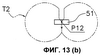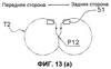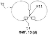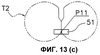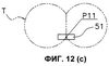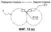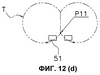 На фиг.13 показан другой пример операции поперечной сварки. В этом случае сваривающие зажимы 51 выполняют оборот вокруг вала 17с, описывая траекторию Т2, имеющую приблизительно D-образную форму и отличающуюся от траектории Т. Сваривающие зажимы 51, выполнившие оборот, захватывают трубчатую пленку в точке Р12, которая располагается ниже упомянутой точки Р10 (см. фиг.13(а) и 13(b)). Сваривающие зажимы 51 затем прикладывают к трубчатой пленке давление и тепло, одновременно перемещаясь вниз, отпускают трубчатую пленку в точке Р11 и затем отделяются друг от друга (см. фиг.13(с) и 13(d)). Иными словами, сваривающие зажимы 51 поперечно сваривают трубчатую пленку, прикладывая давление и нагрев к трубчатой пленке при перемещении вниз с той же скоростью, что и трубчатая пленка, от точки Р12 к точке Р11. Далее, после разрезания пленки встроенным режущим устройством и отпускания трубчатой пленки, из которой в точке Р11 формируется пакет В, пакет В выдается вниз.