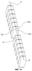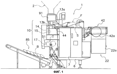 Расстояние между группами пакетов В равно расстоянию, на которое полоса S продвигается после прикрепления к полосе S последнего пакета В из группы пакетов В и до прикрепления к полосе S первого пакета В из следующей группы пакетов В. Обычно это расстояние устанавливают более длинным, чем упомянутый выше шаг транспортировки между соседними пакетами В в одной и той же группе. Режущее устройство 45 выполняет надрез 45а, а перфорирующее устройство 46 выполняет отверстие 46а в длинном интервале S2 полосы между одной группой пакетов В и другой группой пакетов В (см. фиг.14). Кроме того, режущее устройство 45 также может выполнить надрез, а перфорирующее устройство 46 также может выполнить отверстие в коротком интервале S1 полосы S, определяемом постоянным шагом транспортировки.