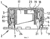 [0008] Фиг.3 показывает самовскрывающееся укупорочное устройство с тремя его составными частями в собранном состоянии в продольном сечении вдоль центральной средней оси закрывающего колпачка. Видно, что самовскрывающая втулка 3 находится между цилиндрическими ограждающими сегментами 17, 18 и штуцером 2 и что поперечная перегородка 23 у верхней кромки втулки 3 попадает в промежуток 19 между находящимися рядом цилиндрическими ограждающими сегментами 17, 18. На внешней стороне втулки 3 виден горизонтальный участок 13 (на чертеже – 12) одного из ее направляющих ребер 12. На внутренней стороне штуцера 2 виден горизонтальный участок 21 направляющей 20, и на внешней стороне штуцера 2 рифление внешней резьбы 6 и несколько ниже – выступ 7 для перехода через него гарантийного пояска 4, а также на нижней стороне штуцера 2 радиально располагающийся выступ 9. На внутренней стороне поворотного колпачка 1 видна его внутренняя резьба 16, a у нижней кромки поворотного колпачка 1 – сформованный за перемычками 5 гарантийный поясок 4. Самовскрывающая втулка 3 в приведенном изображении находится в исходном положении, то есть полностью погруженной внутрь поворотного колпачка 1.