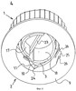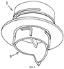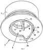 [0010] На приведенных чертежах фиг.4 и 5 особенно хорошо показано функционирование этого самовскрывающегося укупорочного устройства. Фиг.4 показывает при этом устройство в собранном состоянии в аксонометрической проекции в виде снизу. Самовскрывающая втулка 3 находится в исходном состоянии. У ее верхней кромки виден фрагмент поперечной перегородки 23, соединяющий друг с другом ее верхнюю кромку в двух местах. Эта перегородка размещается между двумя цилиндрическими ограждающими сегментами 17, 18, сформованными на нижней стороне свода поворотного колпачка 1. Если колпачок 1 поворачивать в сторону открывания, то есть в приведенном здесь изображении с видом снизу по часовой стрелке, то цилиндрические сегменты 17, 18 захватывают находящуюся между ними поперечную перегородку 23 и при этом втулку 3, вследствие чего она благодаря приспособленным для этого направляющим ребрам 12 на ее внешней стороне и направляющей 20 на внутренней стороне штуцера 2 вынуждена опускаться вниз по крутой спирали. При этом острый наконечник 24 просечного дорна 10 вначале протыкает приваренный к нижней стороне выступа 9 штуцера бумаго- или картоноламинат комбинированной упаковки.