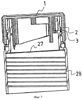 [0013] Фиг.7 показывает еще одно альтернативное исполнение этого укупорочного устройства для установки на заделанную пленкой горловину какой-либо емкости или бутыли. Поэтому выливной штуцер 2 на своей нижней стороне не имеет выступа, но за буртиком 27 он переходит в винтовую муфту 28, которая может быть соединена с внешней резьбой горловины бутыли, или навинчена на выливной штуцер какой-либо емкости, заделанной в своей верхней части пленочным материалом.