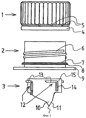 фиг.1 – самовскрывающееся укупорочное устройство с тремя его составными частями, отделенными друг от друга, вид сбоку;