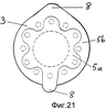 На фиг.21 сплошная тонкая линия на поверхности крышки показывает пробивание только отделяемого пленочного покрывающего слоя запорной крышки 3, которая у изображенной здесь банки с горючим содержит два расположенных, по существу, концентрично друг другу отделяемых пленочных элемента 5а, 5b, причем в зависимости от нужных мощности горелки и продолжительности горения можно удалить либо только центральный отделяемый пленочный элемент 5а (для меньшей мощности горелки и большей продолжительности горения), либо оба отделяемых пленочных элемента 5а, 5b (для большей мощности горелки и меньшей продолжительности горения). В результате удаления центрального отделяемого пленочного элемента 5а открываются центральное круглое отверстие горелки и несколько меньших круглых воздухоподводящих отверстия, окружающие это отверстие горелки с равным шагом, благодаря чему возникает форма отверстия базовой горелки. Если дополнительно отделяют отделяемый пленочный элемент 5b, то открываются дополнительные воздухоподводящие отверстия описанного выше вида, в результате чего возникает форма отверстия горелки повышенной мощности.