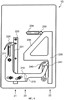 На фиг.8 показан второй вариант выполнения третьего элемента для изменения размеров рабочего внутреннего пространства устройства 10 для приема банкнот. В этом втором варианте устройство 10 для приема банкнот в основном соответствует устройству 10 для приема банкнот, выполненному по первому варианту. Оно также имеет (первый) рычаг 210, который установлен на оси 211 с возможностью поворота вокруг нее. Рычаг 210 имеет первую собачку 220, которая зацепляется с зубьями 221 рейки 223. Рейка 223 перемещается в направляющей 224 и служит для позиционирования внутренней стенки 12 и тем самым для регулировки длины длинной стороны периметра рабочего внутреннего пространства. Для позиционирования внутренней стенки 11 и тем самым для регулировки длины короткой стороны периметра рабочего внутреннего пространства служит другая – вторая – рейка 230, которая имеет зубья 241, с которыми зацепляется вторая собачка 240 рычага 210. На второй рейке 230 расположена наклонная направляющая 235, которая воздействует на соединение 233, перемещающееся в направляющей 234. При перемещении второй рейки 230 соединение 233 перемещается в направляющей 234, а вместе с ним перемещается и внутренняя стенка 11, которая в результате устанавливается в требуемое положение. Рычаг 210 также имеет (см. фиг.4-7) направляющий упор 215, который аналогично описанному выше варианту служит для выведения собачек 220, 240 из зацепления с соответствующими зубьями. В местах, обозначенных стрелками 21-23, внутрь устройства 10 для приема банкнот входят элементы 21-23 регулировочного устройства 20, которые обеспечивают описанную выше настройку размеров опорной поверхности.