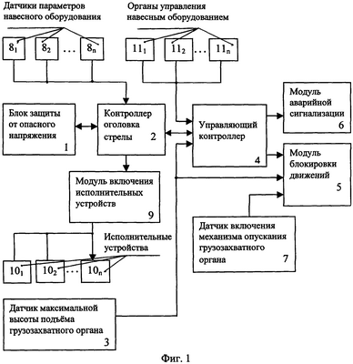 При установке на оголовке стрелы дополнительного оборудования, например маневрового гуська, люльки, фары рабочего освещения и т.д., к информационным входам контроллера 2 оголовка стрелы подключаются датчики 8 параметров (датчик освещенности, датчик скорости ветра, датчик угла наклона пола люльки, датчик усилия, датчики длины и угла наклона гуська и т.д.), а к выходу контроллера 2 оголовка стрелы через модуль 9 включения исполнительных устройств 10 навесного оборудования могут быть подключены различные исполнительные устройства (электромагниты гидрораспределителя механизма горизонтирования пола люльки, фары, габаритные огни и т.п.). Управление исполнительными устройствами 10 может осуществляться контроллером 2 оголовка стрелы по сигналам датчиков 8, например включение габаритных огней и фары по сигналу датчика освещенности или управление положением люльки по сигналу датчика угла. Управление исполнительными устройствами 10 может осуществляться также по сигналам от подключенных к информационным входам управляющего контроллера 4 органов 11 управления навесным оборудованием, передаваемых по двухстороннему каналу обмена данными на контроллер 2 оголовка стрелы. По этому же каналу может производиться управление чувствительностью блока 1 защиты от опасного напряжения.