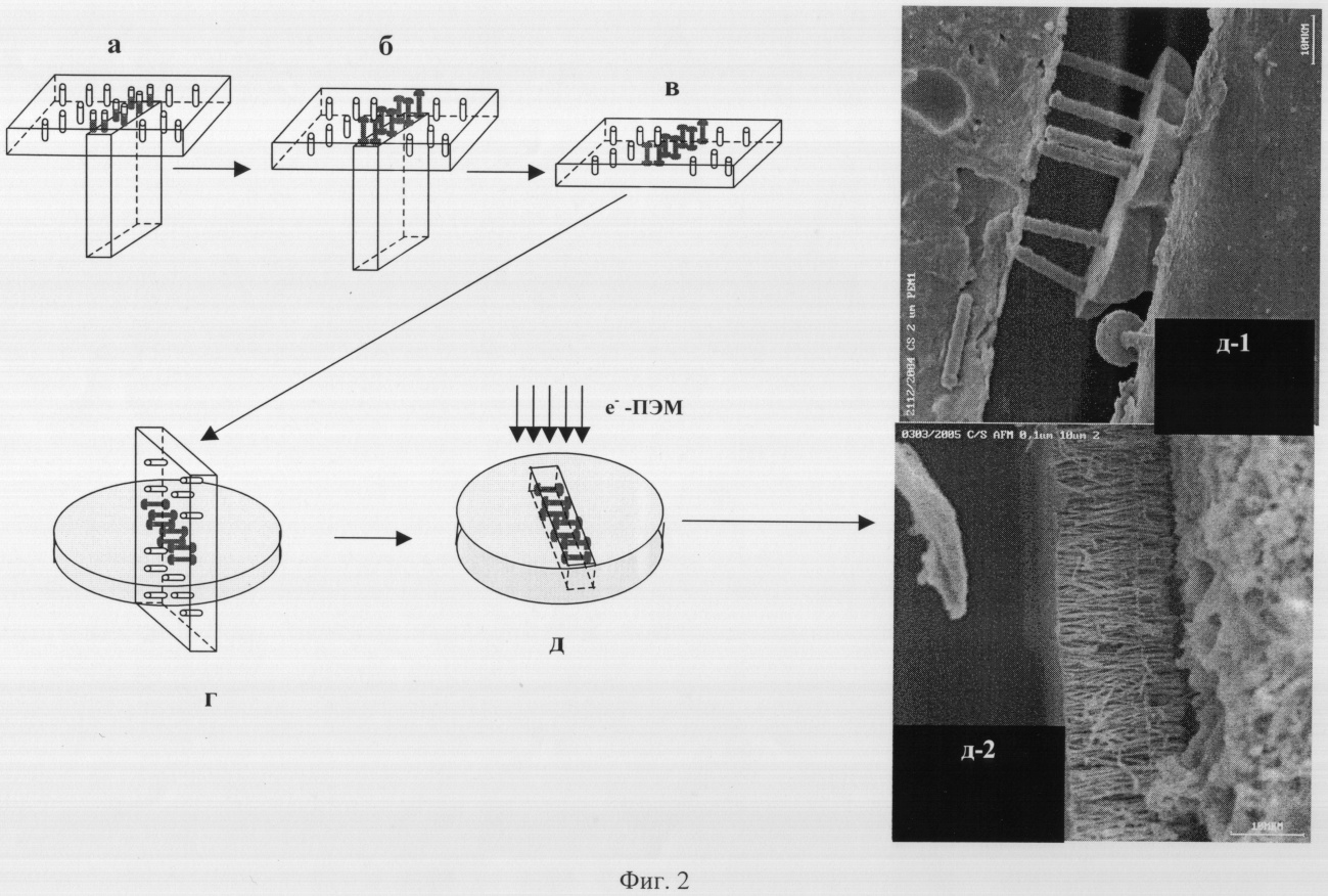 Первым отличием данного способа от варианта I является использование в качестве подложки-катода металла с более отрицательной величиной химического потенциала по отношению к гальванически формируемому металлическому осадку. Например, в случае гальванического осаждения меди материалом подложки-катода может быть молибденовая фольга или проволока. В этом случае из-за отсутствия химической адгезии медного осадка на поверхности торца молибденовой фольги или проволоки на нижней поверхности мембраны в областях травленых каналов, прилегающих к поверхности торца подложки-катода первоначально формируются т.н. «грибки», являющимися центрами гальванического зарождения в травленых каналах металлического осадка и последующего их роста вплоть до формирования вторичных «грибков» уже на верхней поверхности мембраны (Фиг.2а-б). После завершения процесса формирования металлических нанопроволочек в ТМ данный композит (полимерная мембрана + металлические нанопроволочки) извлекается из электрохимической ячейки, промывается и высушивается (Фиг.2в). Затем из нее вырезают полоску шириной около 4 мм, которую заливают в области металлических наноструктур тонким слоем химически стойкого клея (эпоксидка), перпендикулярным к поверхности полоски композита (Фиг.2г). После полного химического растворения материала мембраны на ее месте в эпоксидной пленке формируется щель, внутри которой распределены нанопроволочки, ориентированные параллельно плоскости тонкой эпоксидной пленки, а следовательно, ориентированные перпендикулярно к пучку электронов в электронном микроскопе (Фиг.2д). На Фиг.2 (д-1 и д-2) приведены электронно-микроскопические изображения нанопроволочек внутри пространства щели в эпоксидной тонкой пленке, на которых хорошо видна структура (размер и геометрический профиль) нанопроволочки, а следовательно, аналогичные параметры травленых каналов в трековой мембране по всей их длине.