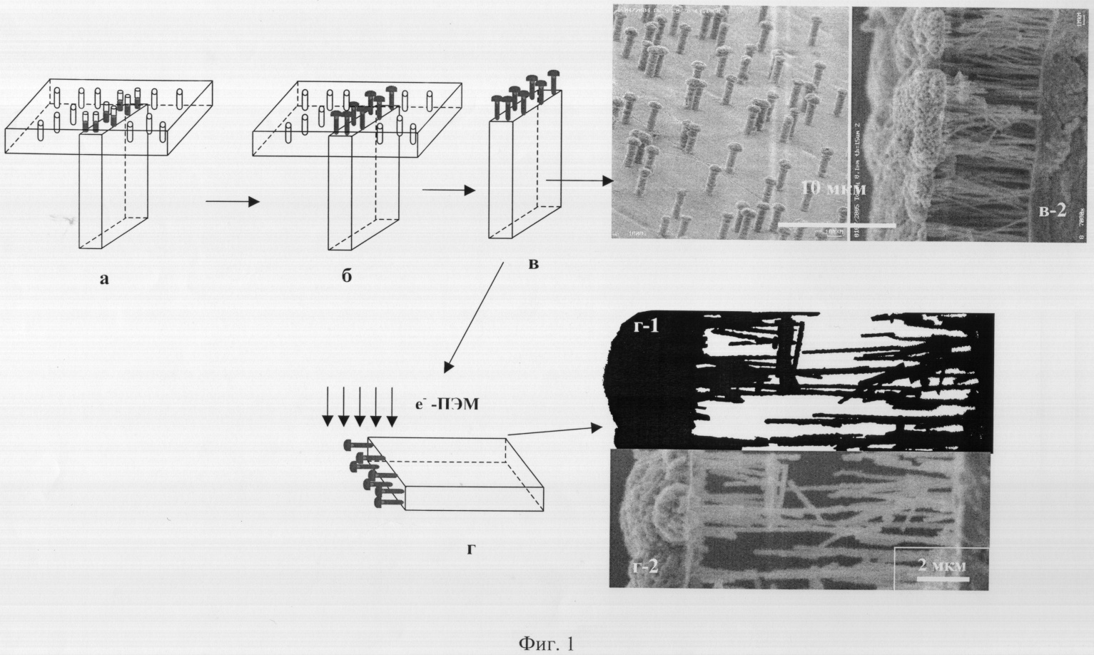 Из металлической (медной) фольги заданной толщины (обычно 10-20 мкм) вырезается узкая полоска шириной около 4 мм (удобной для последующего ее монтажа в объектодержатель электронного микроскопа). Трековая мембрана с травлеными каналами искомых размера и геометрического профиля вакуумно-плотно прижимается к поверхности торца фольги или проволоки (Фиг.1а), которые служат в качестве катода. Сборка помещается в электрохимическую ячейку с медным анодом и заливается соответствующим электролитом, в частности CuSO4×5H2O (70 г/л)+H2SO4 (175 г/л)+Н2О для формирования осадка из медных атомов. На Фиг.1а,б видно, что гальваническое зарождение и рост металлического (медного) осадка происходит только в области мембраны, плотно контактирующей с поверхностью торца фольги(проволока)-подложки (катода). Процесс гальванического роста медного осадка проводится до полного заполнения сквозных травленых каналов мембраны и продолжается вплоть до формирования на ее поверхности «грибков» (Фиг.1б). Затем мембрану растворяют в соответствующем химическом растворе, после чего на поверхности торца металлической фольги-подложки остается реплика в виде металлических нанопроволочек с грибками на конце (Фиг.1в). При этом выращенные нанопроволочки репродуцируют размер и геометрическую форму сквозных травленых каналов в мембране и расположены в плоскости фольги-подложки (Фиг.1, в-1, в-2). При размещении данного объекта в ПЭМ нанопроволочки с «грибками» располагаются перпендикулярно электронному пучку в просвечивающем электронном микроскопе (Фиг.1 г), что обеспечивает визуализацию размера и геометрического профиля по всей их длине, т.е. толщине трековой мембраны (Фиг.1г-1, г-2).