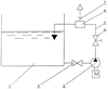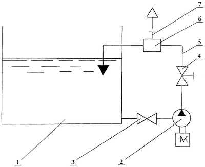 На чертеже показана технологическая схема ликвидации отработанных жидких сред (жидких отходов). Она включает в себя емкость 1 с отработанной жидкой средой, кавитирующее устройство 2, отсечной вентиль 3, установленный на нагнетательной трубе 5, регулирующий вентиль 4, сепаратор 6 с патрубком отбора 7.