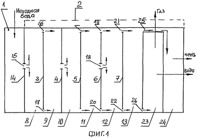 Установка для осуществления заявляемого способа содержит герметично выполненный отстойник (см. фиг.1) цилиндрической формы или в виде прямоугольника в сечении, включающий предварительную камеру 1 для подачи исходной воды в основную камеру 2, разделенную перегородками 3-7 на отдельные камеры 8-13.