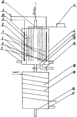 После очистки в корпусе 1 вода перетекает в корпус 12 при помощи патрубка 14, скорость и объем наполнения которого регулируют водяным затвором 15. Когда корпус 12 заполняется на 4/5 общего объема, то водяной затвор 15 закрывают, и подача воды прекращается, причем в этот момент подача очищаемой воды в корпус 1 также прекращается. При помощи хладагента, протекающего по внешнему холодильнику 13, происходит замораживание воды до перехода ее в твердую фазу в количестве 8-10% (масс.), т.к. примеси имеют более низкую температуру замерзания, чем чистая вода, удаление не замороженной воды обеспечивает удаление вместе с ней всех вредных примесей. Выполнение второго корпуса из пищевого алюминия обусловлено тем, что для очистки может подаваться вода для пищевых целей. Кроме этого, пищевой алюминий имеет высокую коррозионную стойкость, не вступает в химические взаимодействия с веществами, содержащимися в воде и не деформируется с понижением температуры ниже 0°С.После этого замораживание прекращают и незамороженную воду сливают через патрубок 17. Затем оставшуюся воду размораживают и через патрубок 16 удаляют.
