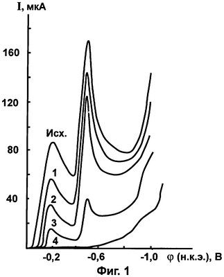 С помощью специальной программы, обеспечивающей задание потенциала, измерение и регистрацию данных электрохимического процесса, через плату ЦАП/АЦП на вход потенциостата задавался потенциал около – 0, 25 В (н.к.э.), положительнее начала выделения металлического серебра (см. Фиг.1). Поскольку проводимость объемно-пористого электрода, состоящего из слоев УВМ, выше, чем проводимость фиксажно-отбеливающего раствора (0,04 См/см), в ходе электролиза поддерживался потенциал наиболее электрически нагруженной ближней к противоэлектроду поверхности объемно-пористого электрода.