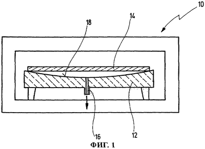 Для дополнительного снижения погрешности формы поверхности изделия до значений, составляющих менее 10 мкм, предпочтительно вакуумное моллирование, как это показано на фиг.1 и 2. При этом у формы 12 из кеатитной стеклокерамики уже в процессе ее изготовления предпочтительно предусматривать один или несколько патрубков 16 для подсоединения к вакуумной линии, которые в процессе последующего горячего формования позволяют создавать между заготовкой стеклянной подложкой 14′ и рабочей поверхностью формы разрежение, как это показано на фиг.2. Подобное разрежение способствует более плотному прилеганию заготовки 14 к рабочей поверхности 18 формы 12 из кеатитной стеклокерамики и обеспечивает тем самым получение готового изделия с высокой точностью формы, погрешность которой составляет менее 10 мкм.
