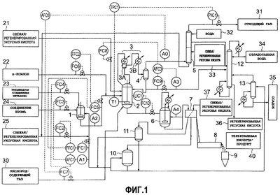 1 – емкость для приготовления реакционного растворителя, 1A – емкость А для приготовления реакционного растворителя, 1B – емкость В для приготовления реакционного растворителя, 2 – реактор окисления, 3 – конденсатор/холодильник, 3А – конденсатор/холодильник (парогенератор: первая стадия), 3B – конденсатор/холодильник (часть с водяным охлаждением: вторая стадия), 4 – газожидкостный сепаратор, 5 – абсорбер газа высокого давления, 6 – кристаллизатор, 7 – сепаратор типа “твердая фаза-жидкость”, 8 – сушилка, 9 – сборник продукта, 10 – резервуар для маточного раствора, 11 – резервуар для промывной (отработанной) жидкости, 12 – ректификационная колонна дегидратации, 13 – выпарная установка маточного раствора, 21 – свежая/регенерированная уксусная кислота, 22 – п-ксилол, 23 – металлический катализатор, 24 – соединение брома, 25 – свежая/регенерированная уксусная кислота, 26 – регенерированная уксусная кислота, 31 – отходящий газ, 32 – вода, 33 – свежая/регенерированная уксусная кислота, 34 – отработанная вода, 35 – осадок, 36 – регенерированная уксусная кислота, 37 – свежая/регенерированная уксусная кислота, 40 – продукт, терефталевая кислота, от А0 до A4, A1A, A1B – анализатор или позиция проведения анализа, от FC1 до FC10, FC1B, FC2A, FC3A, FC3B, FC4A, FC4B – регулятор потока, PIC1 – регулятор давления, TI – индикатор температуры, LIC1 и LIC2 – индикатор/регулятор уровня жидкости, FFC1 и FFC2 – задатчик соотношения потоков, TPC1 – регулятор температура-давление, AFC0, AFC1, AFC3, AFC1A, AFC1B – анализатор/задатчик потока.
