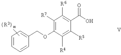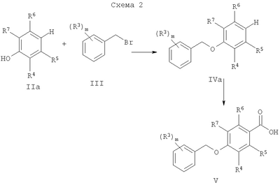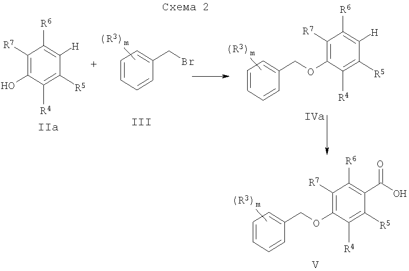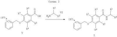 для получения соединения формулы и, если желательно, превращают соединение формулы I в фармацевтически приемлемую соль. Согласно настоящему изобретению соединения общей формулы I могут быть получены в соответствии с приведенной ниже схемой: соединение формулы II обрабатывают бензилбромидами формулы III в присутствии карбоната калия для получения соединений формулы IV, которые затем нагревают с раствором гидроокиси натрия для образования кислот формулы V. Альтернативно, кислоты формулы V (где R5=R6=F) могут быть получены, как показано на схеме 2, путем O-бензилирования фенолов формулы IIа для получения IVa, такое соединение может быть прометаллировано по орто-положению (например, вводят литий с помощью BuLi), далее смешивают с углекислым газом и реакционную смесь подкисляют для получения кислот формулы V. Активирование кислот формулы V с помощью карбонилдиимидазола (или других подходящих активирующих средств) с последующей обработкой аминами типа VI приводит к соединениям формулы I (схема 3). Фармацевтически приемлемые соли соединений формулы I могут быть легко получены согласно известным по сути способам и с учетом природы соединения, превращаемого в соль. Неорганические или органические кислоты, как, например, соляная кислота, бромистоводородная кислота, серная кислота, азотная кислота, фосфорная кислота или лимонная кислота, муравьиная кислота, фумаровая кислота, малеиновая кислота, уксусная кислота, янтарная кислота, винная кислота, метансульфокислота, п-толуолсульфокислота и им подобные кислоты, годятся для образования фармацевтически приемлемых солей основных соединений формулы I. Соединения, которые содержат щелочные металлы или щелочноземельные металлы, например натрий, калий, кальций, магний или им подобные, основные амины или основные аминокислоты годятся для образования фармацевтически приемлемых солей кислотных соединений. Соединения формулы I и их фармацевтически приемлемые соли являются, как уже указывалось выше, ингибиторами моноаминоксидазы В и могут быть применены для лечения или предупреждения заболеваний, при которых ингибиторы МАО-В могут быть полезными. Такие заболевания включают острые и хронические неврологические расстройства, нарушения познавательной способности и дефицит памяти. Поддающимися лечению неврологическими расстройствами являются, например, травматические или хронические дегенеративные процессы нервной системы, как, например, болезнь Альцгеймера, другие виды слабоумия, снижение до минимума познавательной способности или болезнь Паркинсона. Другие показания включают психиатрические заболевания, как, например, депрессия, тревога, приступ паники, социофобия, шизофрения, нарушение питания и нарушение обмена веществ, как, например, ожирение, а также предупреждение и лечение абстинентных синдромов, вызванных злоупотреблением алкоголем, никотином и другими чрезмерно употребляемыми наркотическими средствами. К другим подвергаемым лечению показаниям может быть отнесен синдром недостаточности (G.M.Sullivan, международная заявка на патент WO 01/34172 А2), заболевание периферической нервной системы, вызванное химиотерапией рака (G.Bobotas, международная заявка на патент WO 97/33572 А1), или лечение рассеянного склероза (R.Y.Harris, международная заявка на патент WO 96/40095 А1) и других нейровоспалительных забол