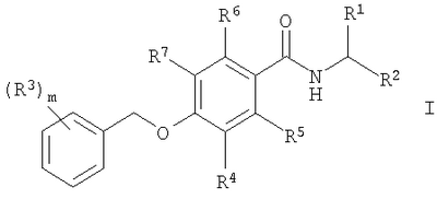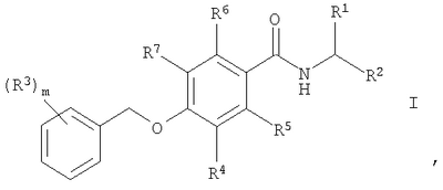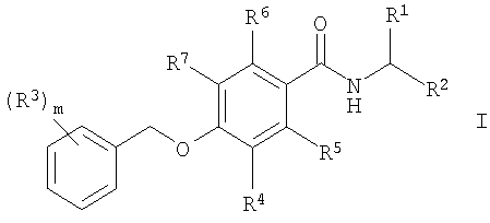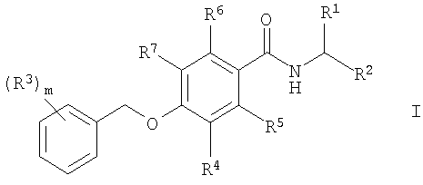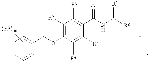 1. Соединение общей формулы где R1 означает водород, (С1-С6)алкил или гидрокси(С1-С6)алкил; R2 означает -CO-NR8R9, -(CH2)n-NR8R9, -(CH2)p-OR8 или -(CH2)n-CN; R3 выбирают из водорода, галогена, галоген(С1-С6)алкила; R4, R5, R6 и R7 означают водород или фтор и, как минимум, один из R4, R5, R6 и R7 означает фтор; R8 и R9 независимо друг от друга означают водород или (С1-С6)алкил; m означает 1, 2 или 3; n означает 0, 1, 2 или 3 и р означает 1 или 2; а также их фармацевтически приемлемые соли. 2. Соединения формулы I по п.1, где R3 означает галоген, галоген(С1-С6)алкил. 3. Соединения формулы I по п.1, где R2 означает -CO-NR8R9 и R8 и R9 независимо друг от друга означают водород или (С1-С6)алкил. 4. Соединения формулы I по п.1, где R5 означает фтор и R4, R6 и R7 означают водород. 5. Соединения формулы I по п.4, где R2 означает -CO-NR8R9 и R8 и R9 независимо друг от друга означают водород или (С1-С6)алкил. 6. Соединения формулы I по п.5, где R3 означает фтор. 7. Соединения формулы I по п.6, которые выбираются из группы, включающей (S)-N-(1-карбамоилэтил)-2-фтор-4-(3-фторбензилокси)бензамид, 2-[4-(3-фторбензилокси)-2-фторбензамидо]ацетамид, (S)-N-(1-карбамоил-2-гидроксиэтил)-2-фтор-4-(3-фторбензилокси)бензамид, (R)-N-(1-карбамоилэтил)-2-фтор-4-(3-фторбензилокси)бензамид, 2-[4-(4-фторбензилокси)-2-фторбензамидо]ацетамид и (S)-N-(1-карбамоилэтил)-2-фтор-4-(4-фторбензилокси)бензамид. 8. Соединения формулы I по п.5, где R3 означает трифторметил. 9. Соединения формулы I по п.8, которые выбираются из группы, включающей (S)-N-(1-карбамоилэтил)-2-фтор-4-(4-трифторметилбензилокси)бензамид и (S)-4-(3,5-бис(трифторметил)бензилокси)-N-(1-карбамоилэтил)-2-фторбензамид. 10. Соединения формулы I по п.4, где R2 означает -(СН2)р-OR8, R8 означает водород или (С1-С6)алкил и р означает 1 или 2. 11. Соединения формулы I по п.10, которые выбираются из группы, включающей (S)-2-фтор-4-(3-фторбензилокси)-N-(2-метокси-1-метилэтил)бензамид, 2-фтор-4-(3-фторбензилокси)-N-(2-метоксиэтил)бензамид и 2-фтор-4-(3-фторбензилокси)-N-(2-гидроксиэтил)бензамид. 12. Соединения формулы I по п.4, где R2 означает -(CH2)n-NR8R9 и где R8 и R9 независимо друг от друга означают водород или (С1-С6)алкил и n означает 0, 1, 2 или 3. 13. Соединения формулы I по п.5, где R2 означает -(CH2)n-CN и n означает 0, 1, 2 или 3. 14. Соединения формулы I по п.1, где R4 означает фтор и R5, R6 и R7 означают водород. 15. Соединения формулы I по п.14, где R2 означает -CO-NR8R9 и R8 и R9 независимо друг от друга означают водород или (С1-С6)алкил. 16. Соединения формулы I по п.15, где R3 означает фтор. 17. Соединения формулы I по п.16, которые выбираются из группы, включающей (S)-N-(1-карбамоилэтил)-3-фтор-4-(4-фторбензилокси)бензамид, 2-[4-(4-фторбензилокси)-3-фторбензамидо]ацетамид, (S)-N-(1-карбамоил-2-гидроксиэтил)-3-фтор-4-(4-фторбензилокси)бензамид, 2-[4-(3-фторбензилокси)-3-фторбензамидо]ацетамид, (S)-N-(1-карбамоилэтил)-3-фтор-4-(3-фторбензилокси)бензамид, (R)-N-(1-карбамоилэтил)-3-фтор-4-(3-фторбензилокси)бензамид и (S)-N-(1-карбамоил-2-гидроксиэтил)-3-фтор-4-(3-фторбензилокси)бензамид. 18. Соединения формулы I по п.15, где R3 означает трифторметил. 19. Соединения формулы I по п.18, которые выбираются из группы, включающей 2-[4-(4-трифторметилбензилокси)-3-фторбензамидо]ацетамид и (S)-N-(1-карбамоил-2-гидроксиэтил)-3-фтор-4-(4-трифторметилбензилокси)бензамид. 20. Соединения формулы I по п.14, где R2 означает -(CH2)p-OR8, R8 означает водород или (С1-С6)алкил и р означает 1 или 2. 21. Соединения формулы I по п. 14, где R2 означает -(CH2)n-NR8R9 и где R8 и R9 независимо друг от друга означают водород или (С1-С6)алкил и n означает 0, 1, 2 или 3. 22. Соединения формул