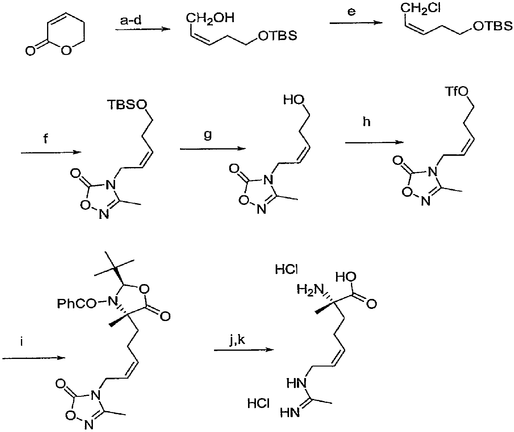 а) КОН, b) MeI, c) TBSCl, d) DIBAL, e) калиевая соль 3-метил-1,2,4-оксадиазолин-5-она, g) AcOH, h) Tf2O, i) KHMDS/(2S,4S)-3-бензоил-2-трет-бутил-4-метил-1,3-оксазолидин-5-он, j) катализатор Линдлара, k) 6N HCl