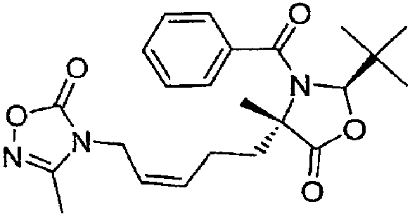 ЕХ-1Е) К раствору (2S,4S)-3-бензоил-2-трет-бутил-4-метил-1,3-оксазолидин-5-она (ссыл.) (532 мг, 2,04 ммоль) в ТГФ (10 мл) при температуре -78°С добавляют KHMDS (4,48 мл, 2,2 ммоль, 0,5 М в ТГФ). Полученный оранжевый раствор перемешивают в течение 15 мин с последующим добавлением ЕХ-1D (580 мг, 1,8 ммоль). Полученный раствор нагревают до комнатной температуры с последующим добавлением KHSO4 (10%, 1,5 мл), насыщенного раствора соли и EtOAc. Органический слой отделяют, сушат и концентрируют в вакууме с получением 960 мг желтого масла. Неочищенный материал очищают флэш-хроматографией на колонке с силикагелем, элюируя EtOAc:гексаном (1:1) с получением 138 мг (18%) желаемого алкилированного продукта в виде прозрачного масла.