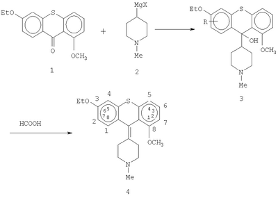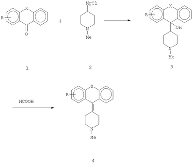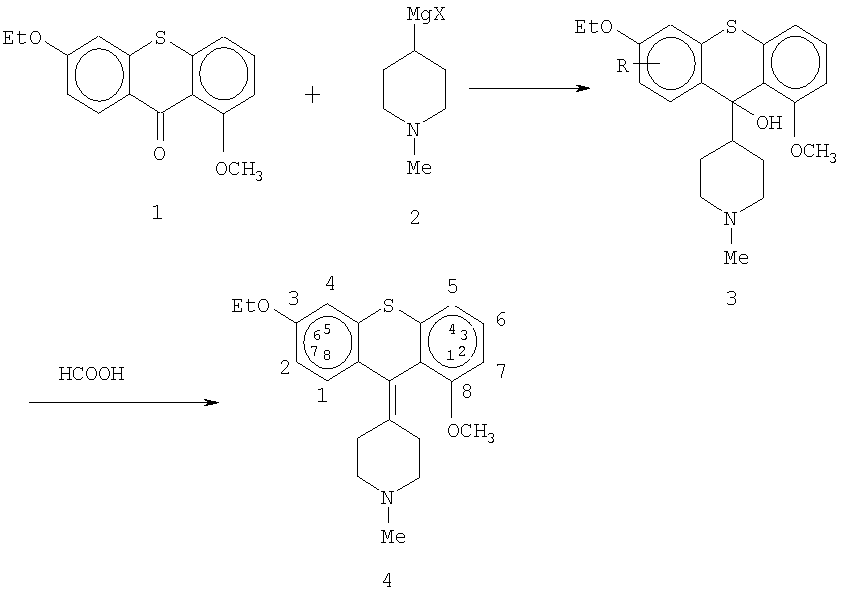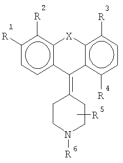 где R1 означает метил, этил, пропил, изопропил, бутил, изобутил, пентил (разветвленный или неразветвленный), гексил (разветвленный или неразветвленный), метокси-, этокси-, пропокси-, изопропокси-, бутокси-, изобутокси-, R2 означает водород, R3 означает водород, R4 означает гидрокси-, метокси-, этокси-, пропокси-, изопропокси-, бутокси-, изобутокси-, метил, этил, пропил, изопропил, бутил или водород, R5 означает водород, R6 означает метил или этил, а Х означает S, N или Se, или фармацевтически приемлемая соль этого соединения, с условием, что, если R1 означает этоксигруппу, а Х означает S, то, по крайней мере, один из R2, R3, R4 и R5 не является атомом водорода. 2. Соединение по п.1, где в общей формуле R1 означает изопропил, метокси- или этоксигруппу, R2 означает водород, R3 означает водород, R4 означает метокси-, гидроксигруппу, этил, метил или водород, R5 означает водород, R6 означает метил, а Х означает S, N или Se, или фармацевтически приемлемая соль этого соединения, с условием что, если R1 означает этоксигруппу, а Х означает S, то, по крайней мере, один из R2, R3, R4 и R5 не является атомом водорода. 3. Соединение по п.2, где соединение выбирается из группы, включающей 4-(6-изопропил-1-метокси-тиоксантен-9-илиден)-1-метил-пиперидин, 4-(6-изопропил-1-гидрокси-тиоксантен-9-илиден)-1-метил-пиперидин,4-(6-этокси-1-этил-тиоксантен-9-илиден)-1-метил-пиперидин, 4-(6-этокси-1-метокси-тиоксантен-9-илиден)-1-метил-пиперидин, 4-(6-этокси-1-гидрокси-тиоксантен-9-илиден)-1-метил-пиперидин, 4-(6-метокси-1-метокси-тиоксантен-9-илиден)-1-метил-пиперидин,4-(3-этокси-селеноксантен-9-илиден)-1-метил-пиперидин,4-(3-этокси-1 -метокси-селеноксантен-9-илиден)-1-метил-пиперидин, 4-(3-этокси-1-гидрокси-селеноксантен-9-илиден)-1-метил-пиперидин, 3-этокси-9-(1-метил-пиперидин-4-илиден)-9,10-дигидроакридин, 6-этокси-1-метокси-9-(1-метил-пиперидин-4-илиден)-9,10-дигидроакридин, 6-этокси-1-гидрокси-9-(1-метил-пиперидин-4-илиден)-9,10-дигидроакридин. 4. Соединение формулы