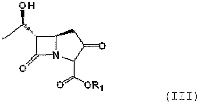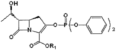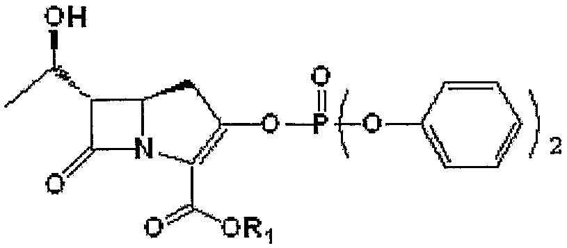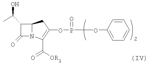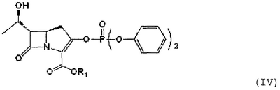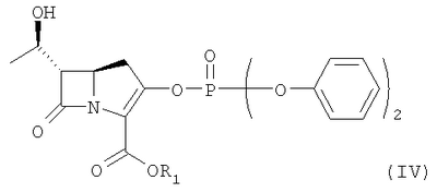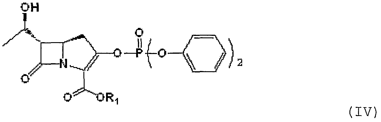 20,0 г (5R,6S)-п-нитробензил-6-[(1R)-1-гидроксиэтил]-1-азабицикло[3,2,0]гепт-3,7-дион-2-карбоксилата формулы III, приведенной ниже, растворяли в смеси раствора ацетонитрила (100 мл) и тетрагидрофурана (100 мл). Температуру реакционной смеси снижали до 0 – -10°С. К реакционной смеси последовательно добавляли 11,1 г N,N-диизопропилэтиламина и 18,5 г дифенилхлорфосфата. Полученную смесь перемешивали в течение 1,5-2 часов при сохранении температуры реакции -10°С с получением енолфосфата формулы IV, приведенной ниже. Енолфосфат формулы IV использовали на следующей стадии без дополнительного выделения.