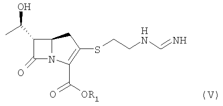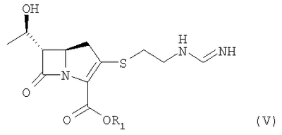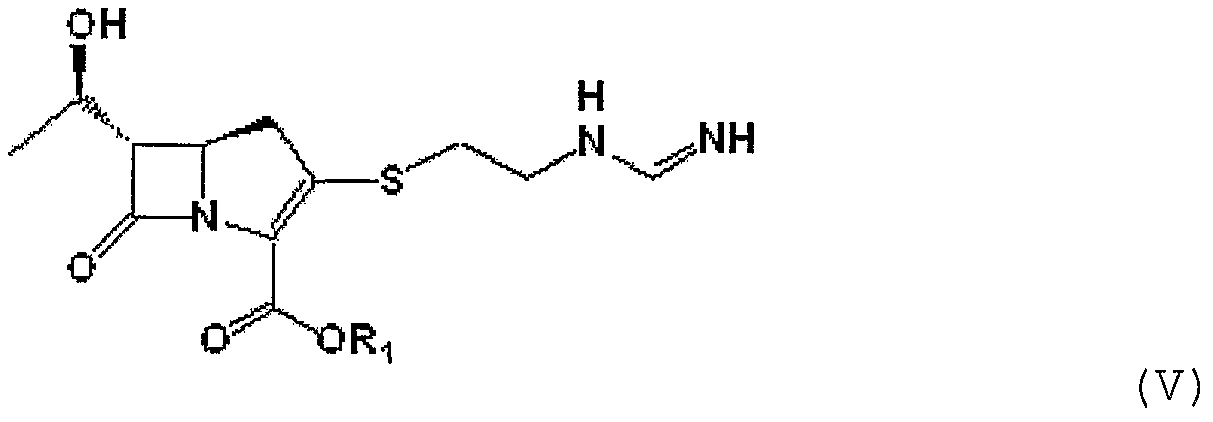 Кроме того, по данному изобретению соединение формулы II приводят во взаимодействие с гидрохлоридом изопропилформимидата или гидрохлоридом бензилформимидата в присутствии основания с получением защищенного по карбоксильной группе имипенема формулы V, гидрированием защищенного по карбоксильной группе имипенема в присутствии катализатора-металла, для удаления защитной группы, с последующей соответствующей обработкой для получения водного раствора, который затем выделяют колоночной хроматографией с обращенной фазой и кристаллизуют из соответствующего спирта или кетона с получением моногидрата имипенема формулы I высокой чистоты с высоким выходом.