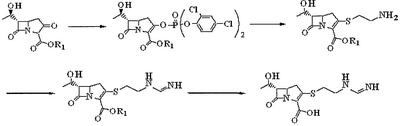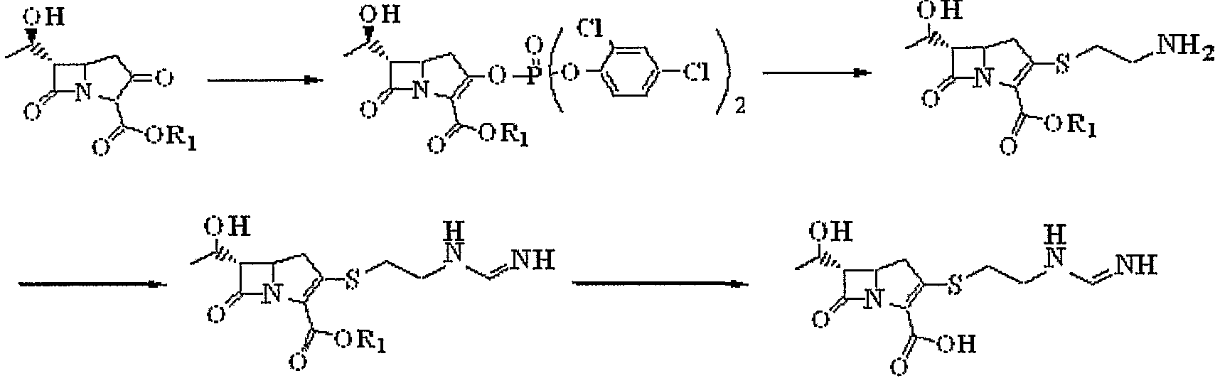 Как представлено на схеме реакций 1, так как процесс, состоящий из четырех стадий, происходит in situ без проведения какого-либо выделения и очистки, конечный продукт неизбежно содержит большие количества примесей, что делает трудными выделение и очистку конечного продукта. Кроме того, процесс сопровождается использованием дорогостоящего бис(дихлорфенил)фосфорхлоридата с целью активации предшественника, бициклического сложного кетоэфира.
