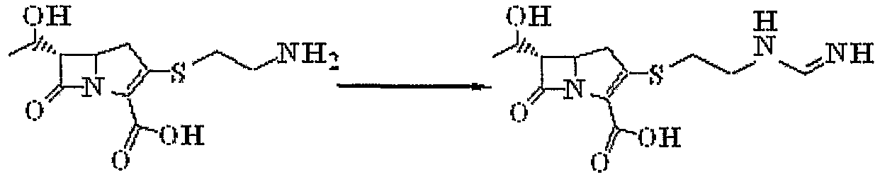 Как представлено на схеме реакций 3, однако, так как химически нестабильный тиенамицин получают из микроорганизма в малом количестве, данный способ является невыгодным из-за плохой экономической эффективности. Кроме того, использование большого количества воды (214-кратное количество от исходного вещества) в качестве растворителя при реакции создает трудности при реакции, выделении и очистке. Кроме того, данный способ имеет тот недостаток, что вместе с целевым продуктом реакции, имипенемом, образуется 5% или более димера бистиенамицинформамидина в качестве нежелательного побочного продукта реакции.