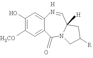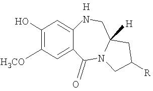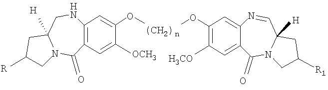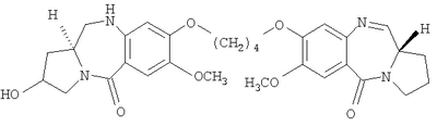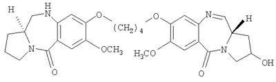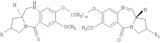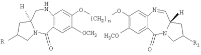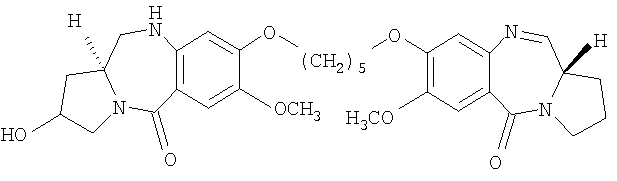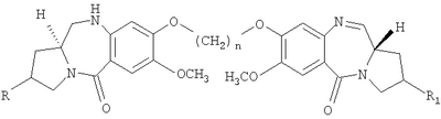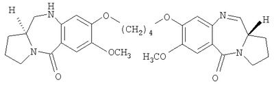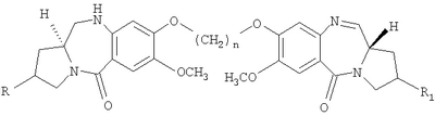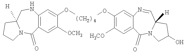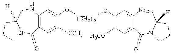 В последние несколько лет появился растущий интерес к разработке новых пирроло[2.1-c][1.4]бензодиазепинов (PBDs). Данные антибиотики взаимодействуют ковалентно с ДНК c образованием N2-гуанинового аддукта, который находится внутри малой бороздки дуплексной ДНК за счет кислотно-лабильной аминальной связи с электрофильным имином в положении N10-C11 (Ссылки: Kunimoto, S.; Masuda, T.; Kanbayashi, N.; Hamada, M.; Naganawa, H.; Miyamoto, M.; Takeuchi, T. and Unezawa, H. J. Antibiot. 1980, 33, 665; Kohn, K.W. and Speous, C.L. J. Mol. Biol. 1970, 51, 551; Hurley, L.H., Gairpla, C. and Zmijewski, M. Biochem. Biophys. Act. 1977, 475, 521; Kaplan, D.J. and Hurley L.H. Biochemistry 1981, 20, 7572). Данные молекулы обладают правосторонним вращением, которое позволяет им следовать по кривизне малой бороздки В-формы двухцепочечной ДНК, включающей три пары оснований. Недавняя разработка посвящена связыванию двух PBD-единиц через их С8-положения с получением бифункциональных алкилирующих средств, способных сшивать ДНК (Ссылки: Thurston, D.E.; Bose, D.S.; Thomson, A.S.; Howard, P.W.; Leoni, A.; Croker, S.J.; Jenkins, T.C.; Neidle, S. and Hurley, L.H. J. Org. Chem. 1996, 61, 8141-8147). Недавно были синтезированы не сшитые смешанные имин-амидные PBD-димеры, которые обладают значительной ДНК-связывающей способностью и потенциальной противоопухолевой активностью (Kamal, A.; Laxman, N.; Ramesh, G.; Ramulu, P. and Srinivas, O. US Pat. No. 636233. dt 26-03-2002; Kamal, A.; Ramesh, G.; Laxman, N.; Ramulu, P.; Srinivas, O.; Neelima, K.; Kondapi, A.K.; Srinu, V.B.; Nagarajaram, H.M. J. Med. Chem. 2002, 45, 4679).