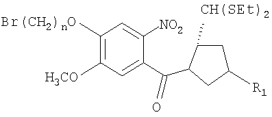 Раствор диэтилтиоацеталя (4R)-гидрокси-(2S)-N-[4-(5-бромпентилокси)-5-метокси-2-нитробензоил]пирролидин-2-карбоксальдегида формулы I (565 мг, 1 ммоль), 8-гидрокси-7-метокси-(11аS)-1,2,3,10,11,11а-гексагидро-5Н-пирроло[2.1-c][1.4]бензодиазепин-5-она (248 мг, 1 ммоль) II и К2СО3 (414 мг, 3 ммоль) в сухом ацетоне (20 мл) кипятили с обратным холодильником 48 ч. После завершения реакции, контролируемой ТСХ, EtOAc, реакционную смесь выливали в воду и затем экстрагировали этилацетатом. Упаривание органического слоя приводило к неочищенному продукту, который затем очищали колоночной хроматографией на силикагеле при элюировании EtOAc, получая чистый диэтилтиоацеталь (4R)-гидрокси-(2S)-N-{4-[5-(7-метокси-(11аS)-1,2,3,10,11,11а-гексагидро-5Н-пирроло[2.1-c][1.4]бензодиазепин-5-он-8-илокси)пентилокси]-5-метокси-2-нитробензоил}пирролидин-2-карбоксальдегида III.